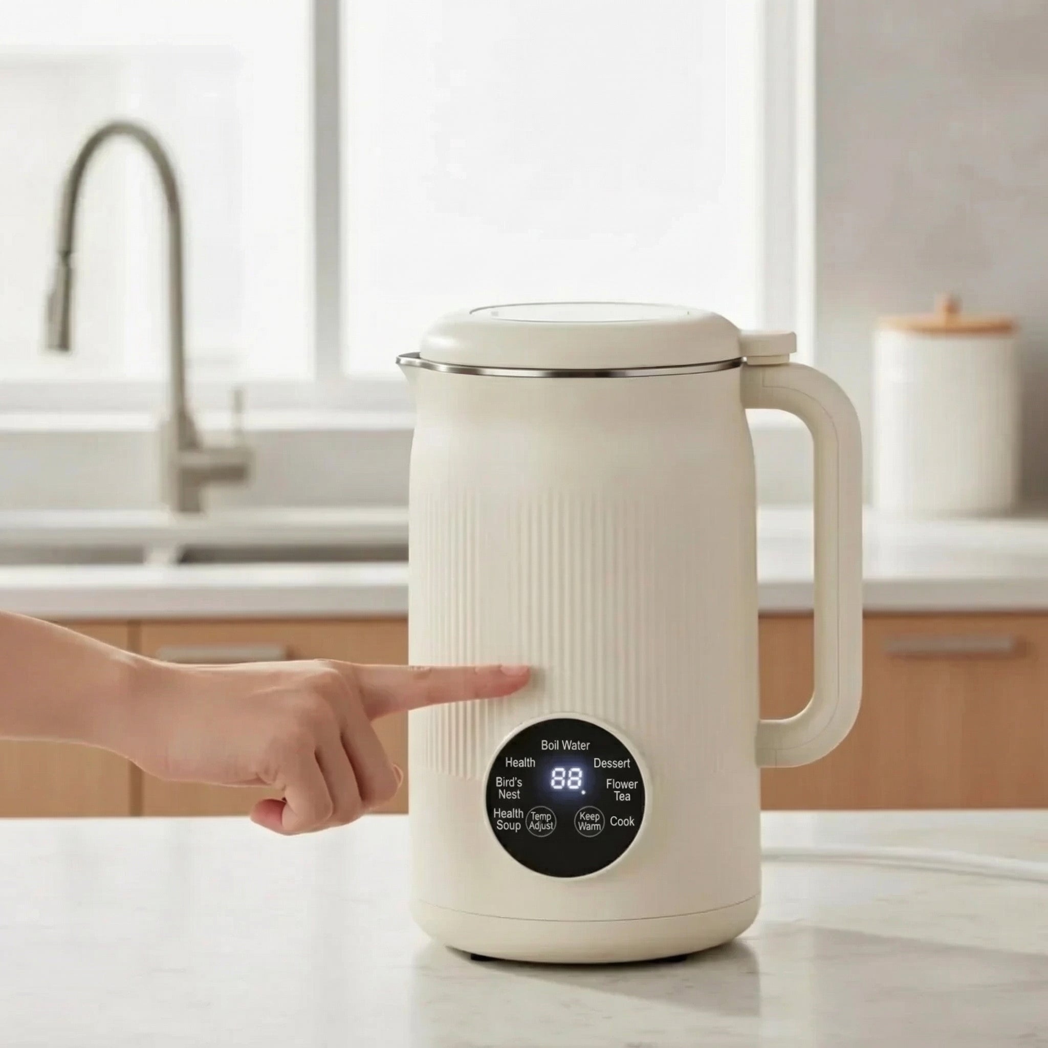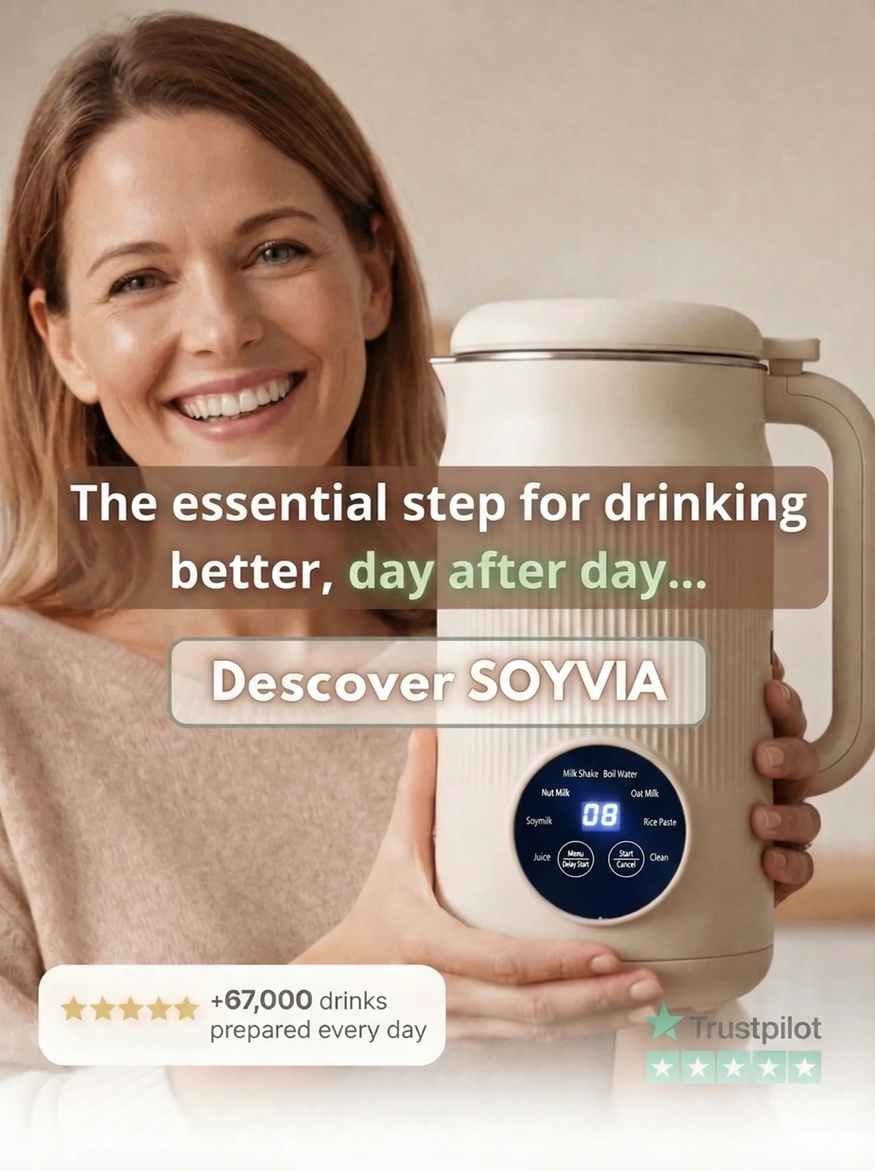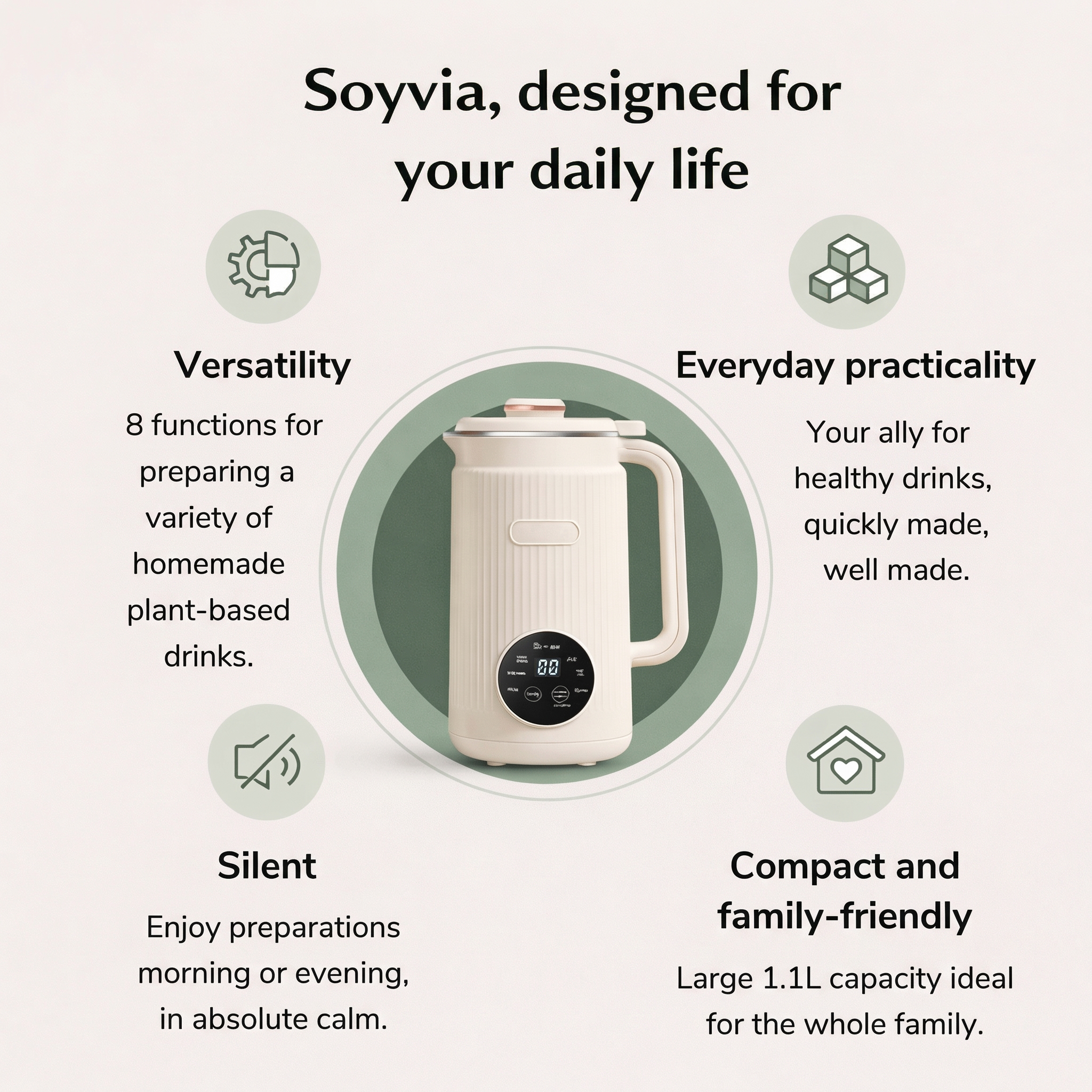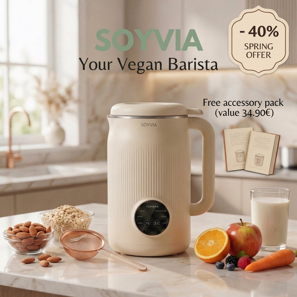 Soyvia transforms your routines: homemade plant-based milks, fresh juices, soups & smoothies — in a single step, with automatic cleaning.